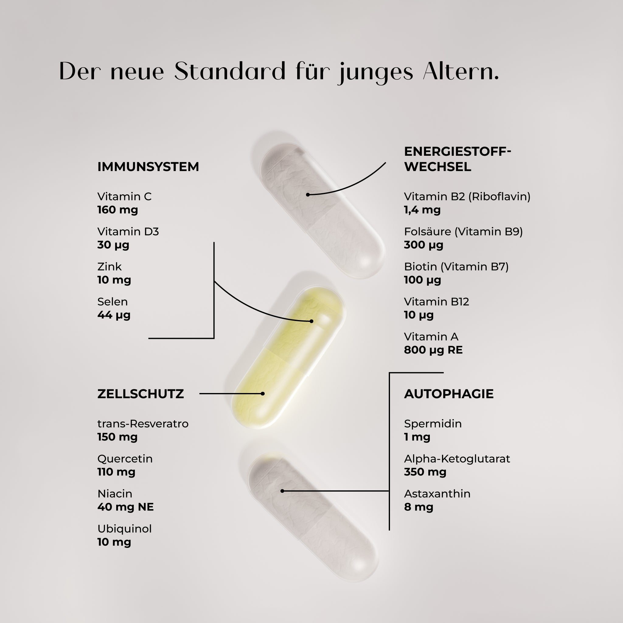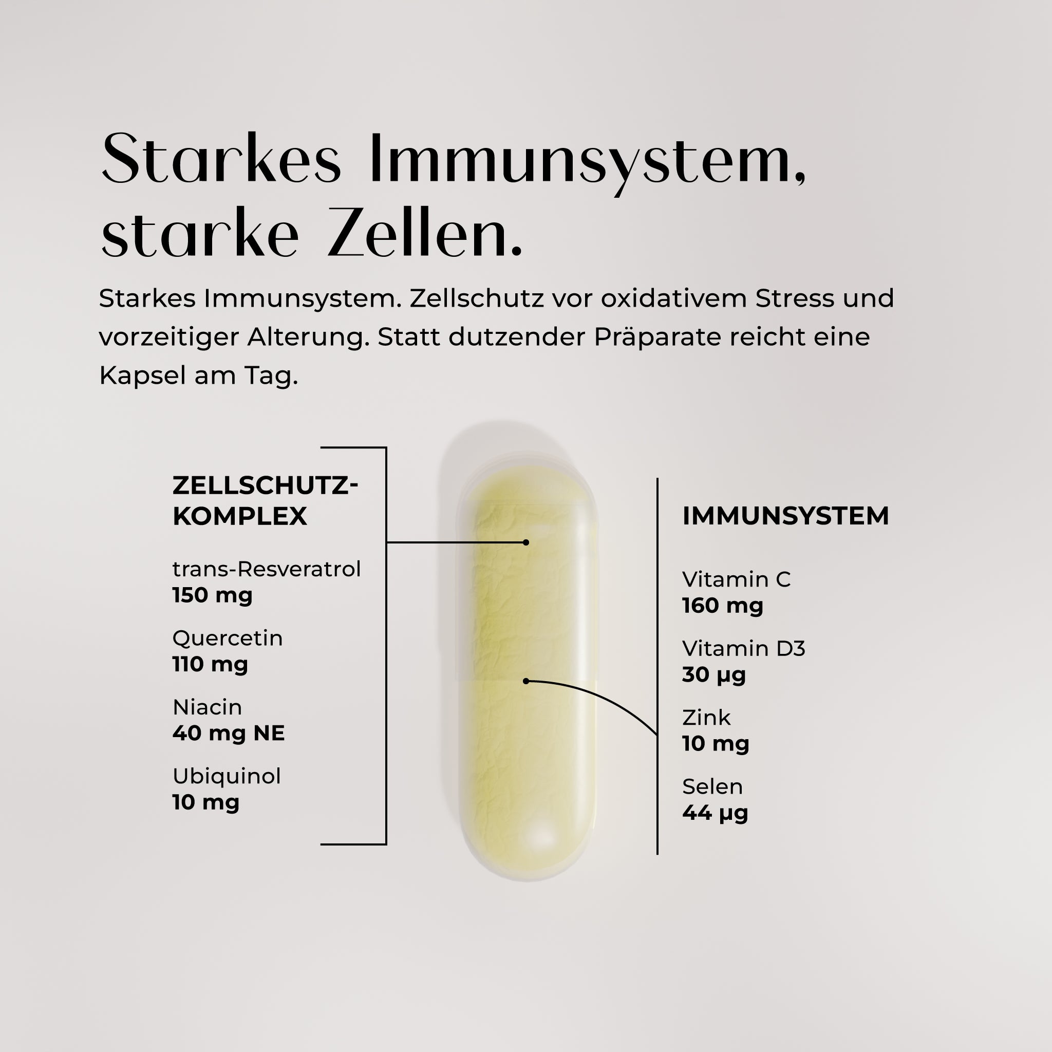 Cell Protect & Immunity enthält mit Resveratrol, Quercetin, Nicotinamid und dem Coenzym Q10 gleich vier Nährstoffe, die deine Zellen schützen und Zellregeneration anregen können. Gleichzeitig bekommst du mit Vitamin C, Zink, Selen und Vitamin D3 deine Multivitamin-Dosis für ein starkes Immunsystem.