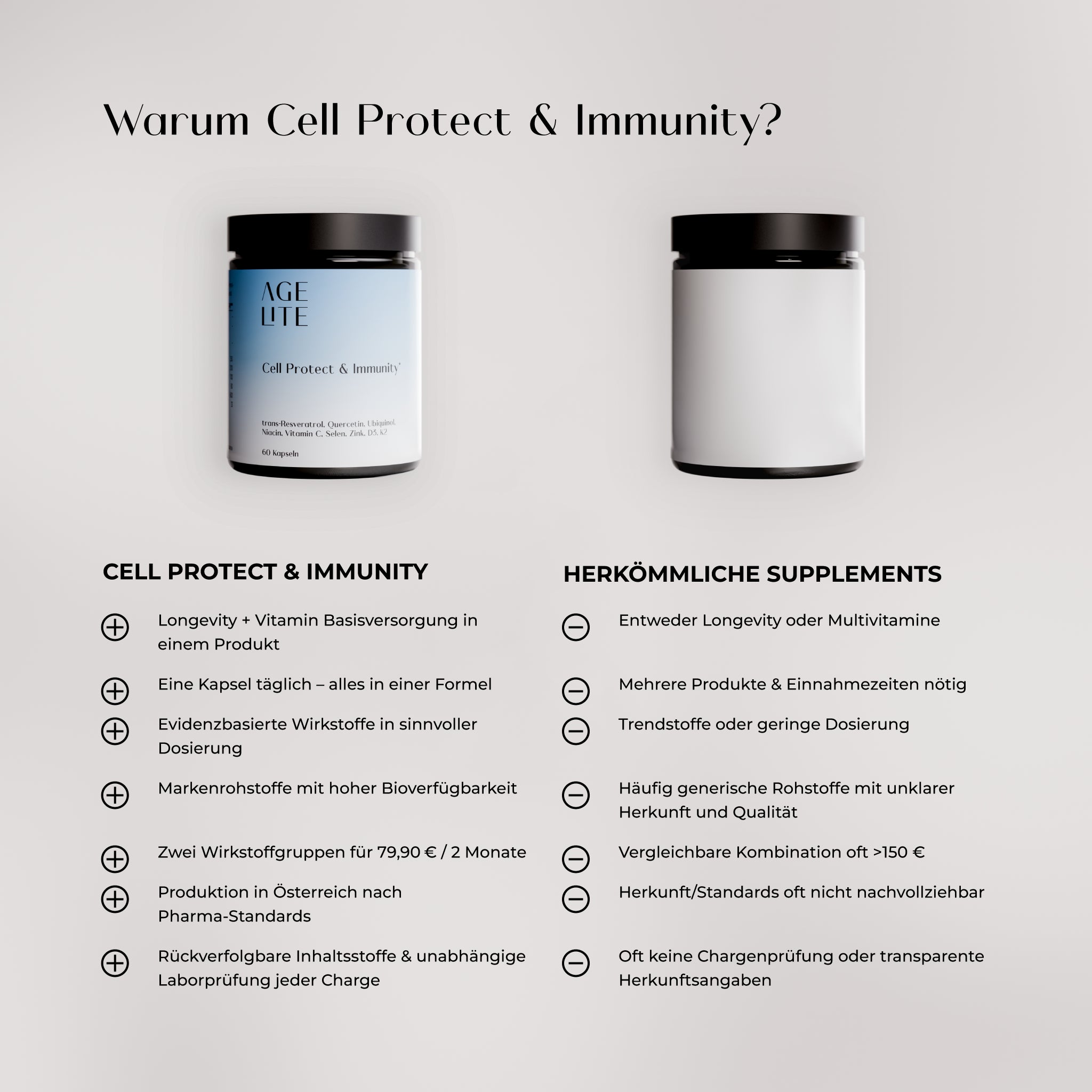Bei AGELITE stehen Qualität und Vertrauen im Mittelpunkt: Wir produzieren in Österreich unter strengsten pharmazeutischen Richtlinien. Unsere Inhaltsstoffe wählen wir gezielt nach Reinheit, Bioverfügbarkeit und wissenschaftlicher Evidenz aus. Jede Charge durchläuft umfassende Prüfungen – sowohl durch unseren Hersteller als auch durch unabhängige Labore in Deutschland. Getestet wird unter anderem auf Reinheit und Schwermetallgehalt. So garantieren wir kontrollierte Premiumqualität bis ins Detail.